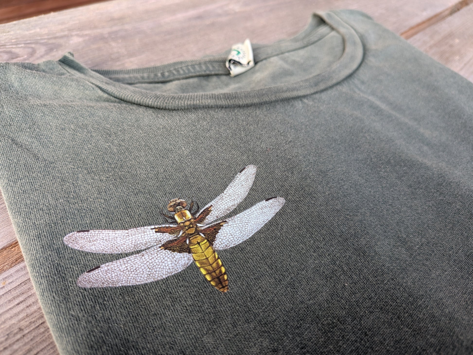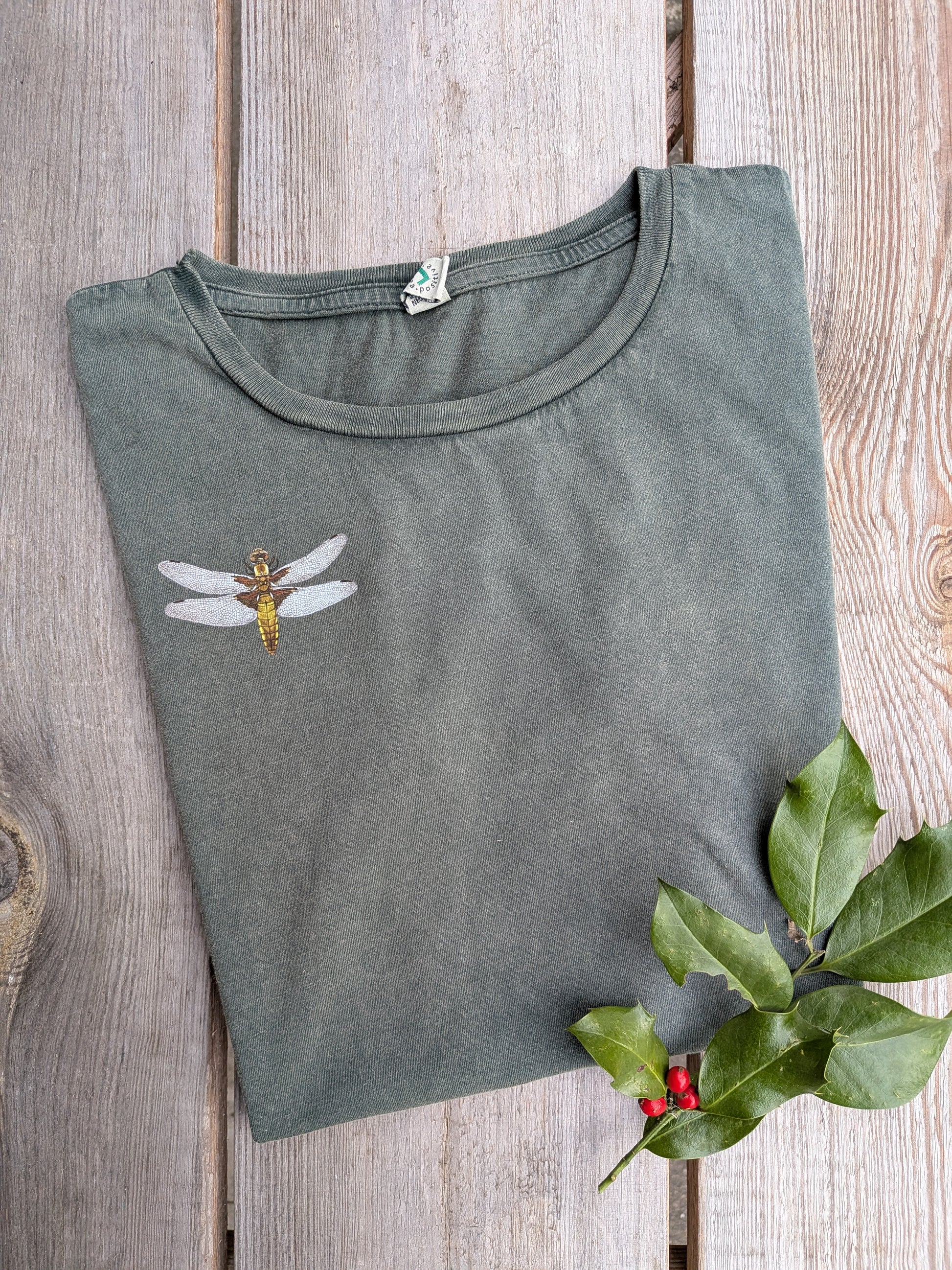 Damen T-Shirt aus nachhaltiger Biobaumwolle in stone washed green mit abgerundetem Saum und aufgerollten Ärmelenden. Das Motiv zeigt eine Plattbauchlibelle. Die Weibchen dieser Art schimmern im Licht goldgelb und haben an den Flügeldecken eine wunderschön rotbräunliche Färbung. Sie benötigen offene Flachwassergewässer mit wenig Vegetation.